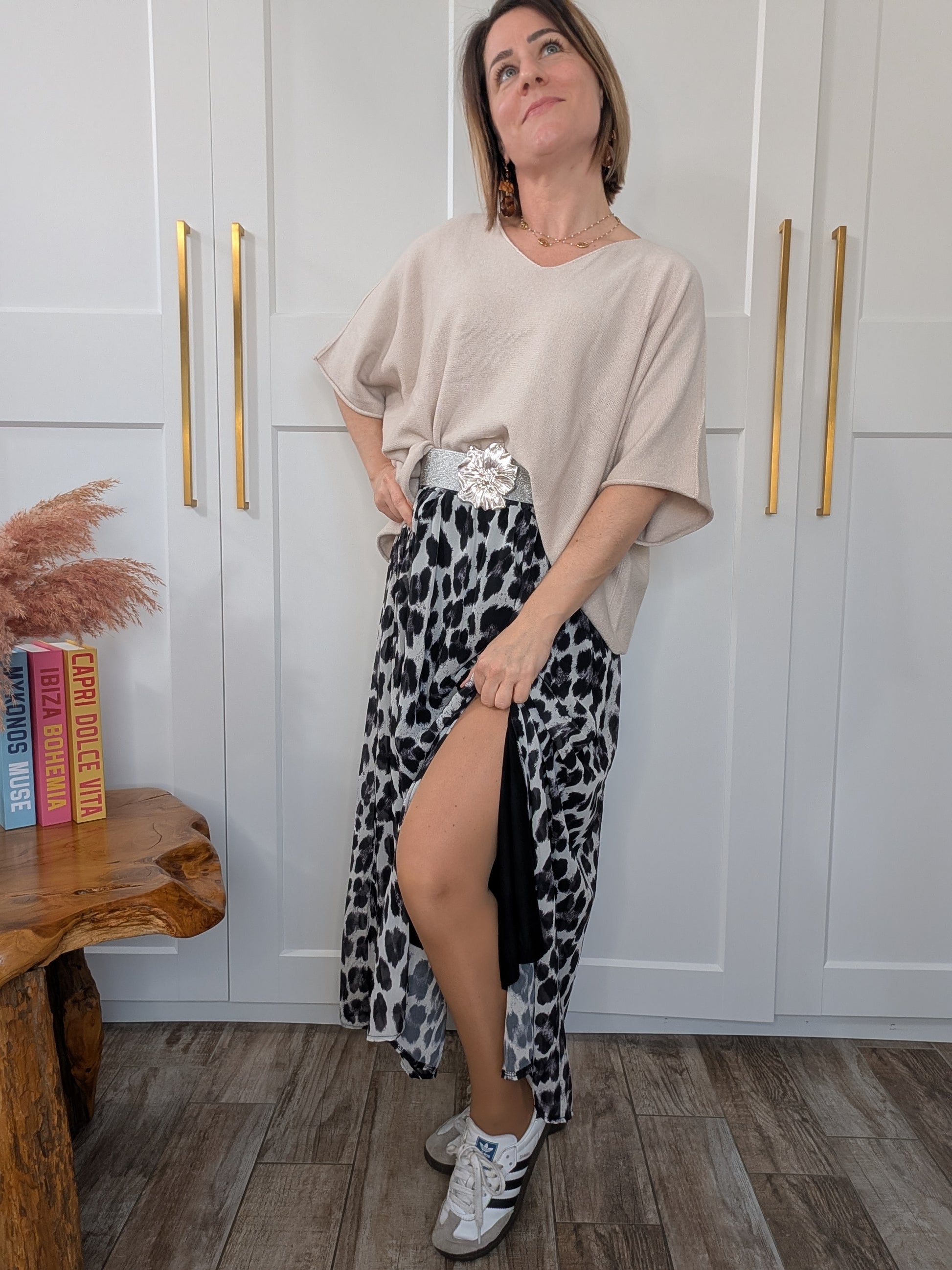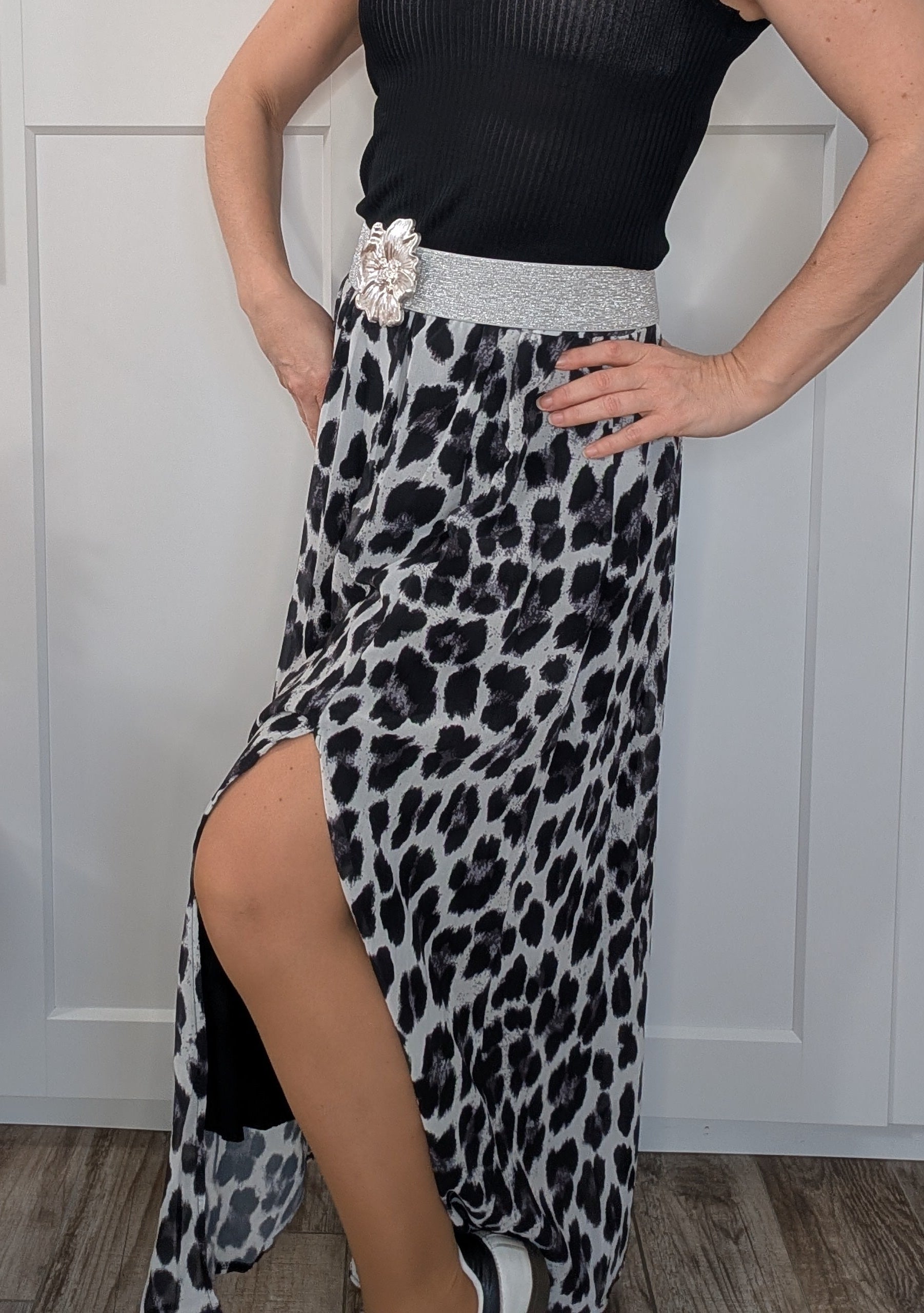 Cette jupe longue fluide imprimé léopard noir, gris et blanc, c’est LA pièce forte et féminine qui transforme instantanément ton look.