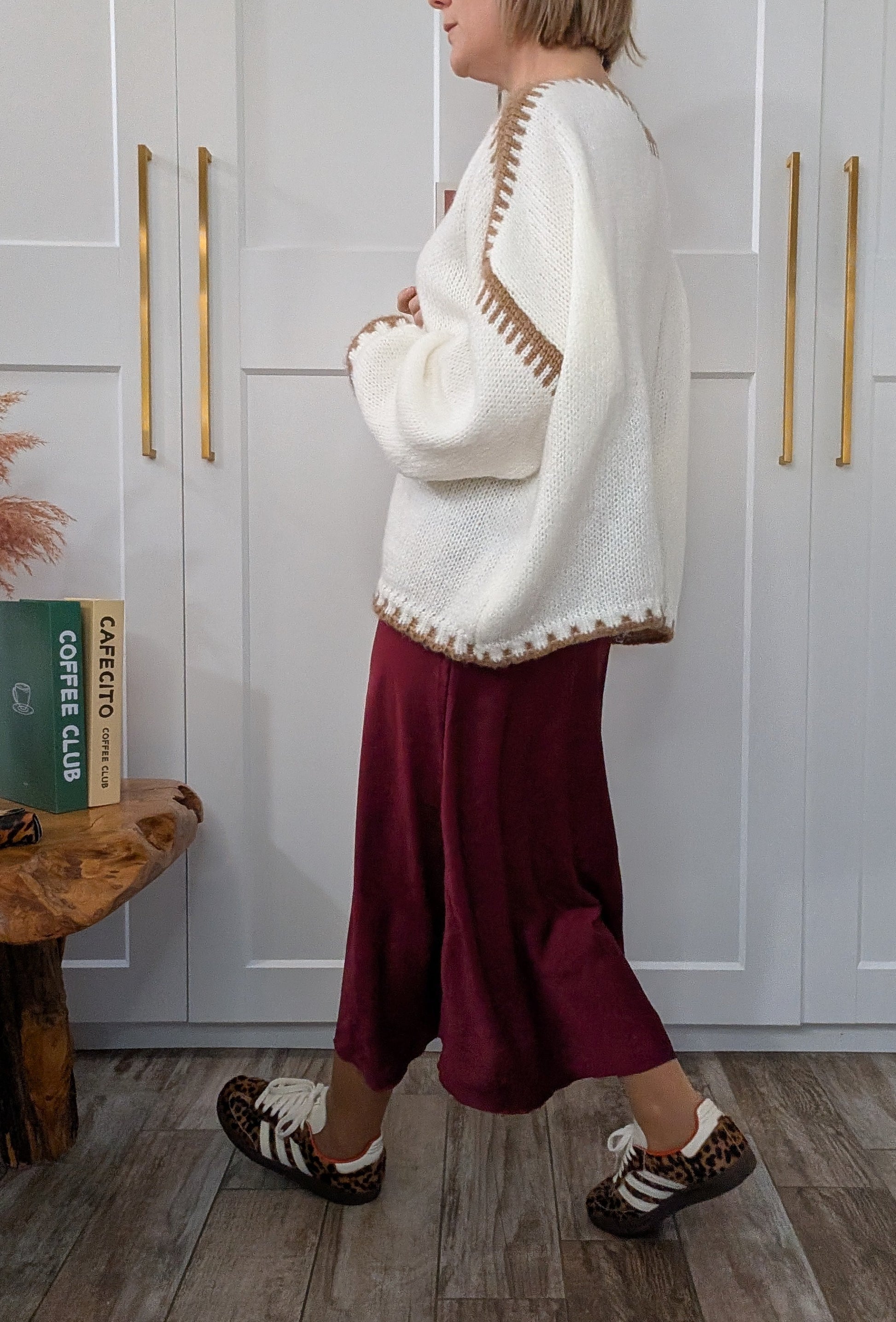 Le pull Lizia blanc est un incontournable oversize qui joue sur les contrastes subtils. Sa coupe généreuse et allongée offre confort et élégance, tandis que ses coutures de teinte caramel créent une signature visuelle distinctive.